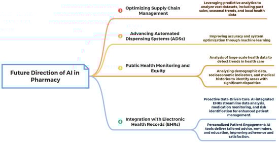As AI applications in pharmacies expand, continuous professional development among pharmacists is essential. Training programs focusing on AI literacy and ethical implementation will equip pharmacists to effectively utilize these tools, enabling them to meet the evolving demands of modern healthcare systems [65] (Figure 5 summarizes the future directions of AI in pharmacy.