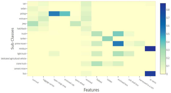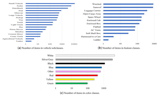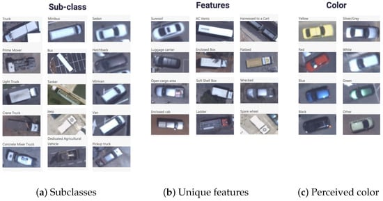 - Features—This category addresses the identification of each vehicle’s unique features. The features tagged in the ‘small vehicle’ category are ‘sunroof’, ‘luggage carrier’, ‘open cargo area’, ‘enclosed cab’, ‘wrecked’, and ‘spare wheel’. The features tagged in the ‘large vehicle’ category are ‘open cargo area’, ‘ac vents’, ‘wrecked’, ‘enclosed box’, ‘enclosed cab’, ‘ladder’, ‘flatbed’, ‘soft shell box’, and ‘harnessed to a cart’ (Figure 2b and Figure 3c).Figure 3b shows the dispersion of the distinctive vehicle characteristics obtained in the dataset, such as ‘sunroof’, ‘luggage carrier’, ‘flatbed’, and ‘spare wheel’. This figure indicates that the current dataset is very detailed in capturing specific features that enable it to be classified with high granularity.