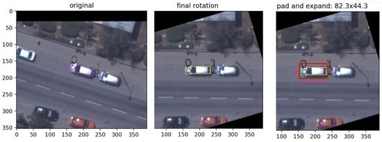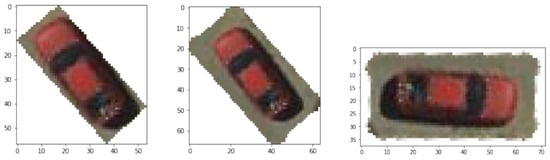 - Cropping—The first step was to crop the vehicles from the image, using the coordinates from the provided input data; but, after observing the data, it was noticeable that the area around the vehicles could reveal information about the vehicles’ properties (spatial context). Each vehicle was cropped with an additional padding of five pixels from the surrounding area (Figure 7).