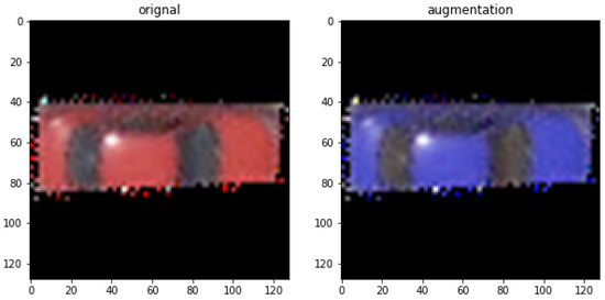 - Color Augmentation—Converting the images from RGB (Red–Green–Blue channels) to HSV (Hue–Saturation–Value) and swapping color channels were methods used to gather more color data (Figure 8).