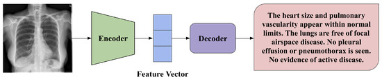 RRG is a fundamental task in radiology, where medical images are analyzed to produce detailed reports that highlight identified abnormalities, their specific locations, and potential differential diagnoses, all aimed at guiding patient treatment [137]. Figure 2 shows a basic framework for RRG, utilizing an encoder–decoder model to generate reports. Typically, a CNN encodes the image into a fixed-length vector representation, while an RNN decodes this representation to produce a descriptive caption. A standardized radiology report typically includes several components: The examination refers to the type of exam performed, while the indication provides the reason for the exam. The comparison notes any references to prior exams, and the technique outlines the scanning method utilized. Additionally, the findings section captures the radiologist’s observations, concluding with an impression that summarizes the key findings [138]. The primary focus of RRG is on drafting the findings and impression sections [18].