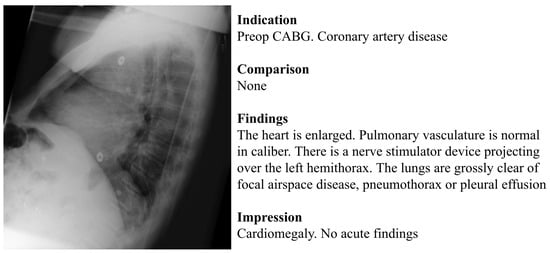 - Johnson, A.E.; Pollard, T.J.; Berkowitz, S.J.; Greenbaum, N.R.; Lungren, M.P.; Deng, C.y.; Mark, R.G.; Horng, S. MIMIC-CXR, a de-identified publicly available database of chest radiographs with free-text reports. Sci. Data 2019, 6, 317. [Google Scholar] [CrossRef] [PubMed]