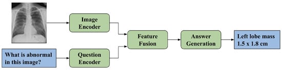 The goal of RVQA is to provide precise answers to image-based questions, thereby reducing repetitive tasks and alleviating the workload of radiologists. Figure 4 depicts a standard RVQA architecture, with components for image encoding, question encoding, feature fusion, and answer generation. The image encoder may use a CNN model such as VGG-16 [163] or ResNet-50 [164], while the text decoder can be an LSTM [85] or a Transformer. Feature fusion between image and question vectors is achieved through either simple concatenation or a Stacked Attention Network (SAN) [165], which employs multiple attention layers to progressively refine attention distributions, focusing on the most relevant image regions for the given question. Typically, RVQA questions can be divided into two categories: open-ended, which generate detailed and free-form answers, and closed-ended, which limit responses to predefined options such as yes/no, multiple-choice answers, or numerical ratings [18,166]. RVQA is approached as either a classification task, where the model picks the answer from a set of candidates, or a generation task, where the model produces open-form text. Sometimes, both methods are combined to enhance results [19].