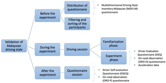 The general methodology can be divided into two (2) phases. The first phase began with the classification of the driving styles of participants. The classification of THE driving style was performed by instructing the participant to answer a Multidimensional Driving Style Inventory (MDSI) self-assessment questionnaire. Since all the potential participants were Malaysian, the MDSI for Malaysian (MDMI-M) drivers was answered [20] to determine whether the participants were careful, risky, angry, anxious, or dissociative drivers. The driving style is determined before the experiment (second phase). For the second phase, 43 participants (from various types of drivers, i.e., careful, risky, angry, anxious, or dissociative) were invited to perform the driving task on-road while being evaluated by the designated observer.
