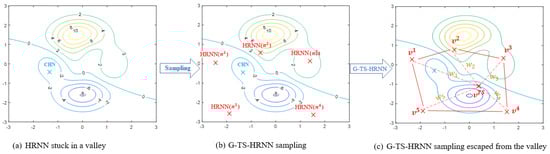Graphically, Figure 4 illustrates the idea behind the G-TS-HRNN method. Indeed, a direct calculation of the HRNN equilibrium point may lead to an Euler–Cauchy attraction to a bad local minimum due to a bad initialization or an inappropriate time step. Despite poor initialization, the generation of several G-TS-HRNNs allows us to cover multiple regions of the search space. The fuzzy combination, using the degree of activation of the different rules, provides an excellent approximation of the HRNN equilibrium state.