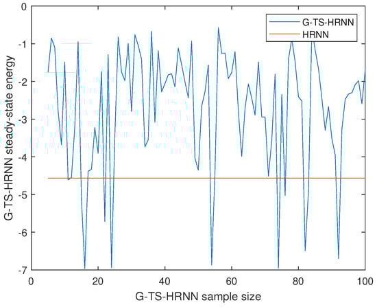 We have calculated the steady points of the G-TS-HRNN for different sample sizes (6 to 100). Figure 5 gives the energy of the G-TS-HRNN for different sample sizes vs. the energy of the HRNN at steady points. The tests were repeated several times, and the curve presents the means of the energies. The red line represents the energy of the HRNN at the steady point. We remark that the curve has several local minima. For some instances, the energy of the HRNN is better than the ones produced by the proposed system. However, the most important thing is that for some instances, the proposed system can produce steady states with better energy compared to classical HRNNs. In this sense, when the optimization problem has several local minima, the Gaussian Takaji–Sugeno sampling technique shows a very high capability to escape the bad valleys thanks to the uniform search at the realizable domain.