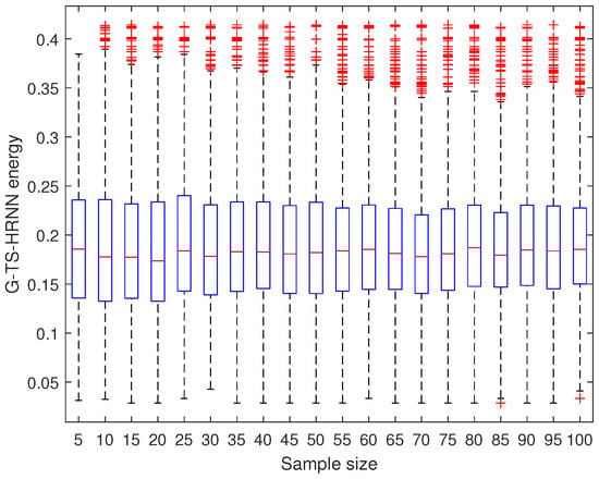 To measure the robustness of the G-TS-HRNN, we calculate the steady point of each sample 100 times and we present the boxplots of the obtained populations; see Figure 6. The maximum dispersion (=0.41) is the one associated with the sample of size 85 and 100; the minimum dispersion (=0.1) is the one associated with the sample of size 5. However, this latter is not interesting because a sample with a small size permits the exploration of only a few regions. In this regard, several other instances (instances of size 30 to 70) have a very small dispersion and are capable of exploring more promising regions in the meantime.