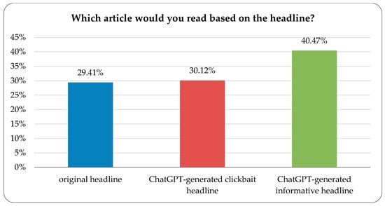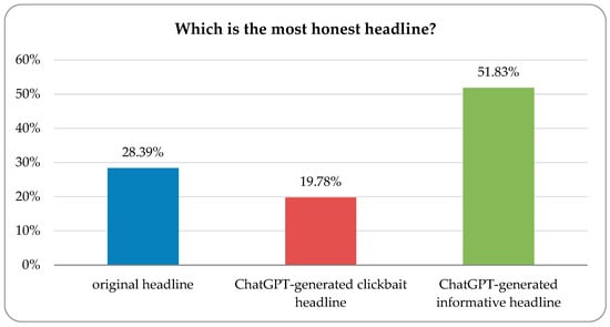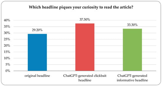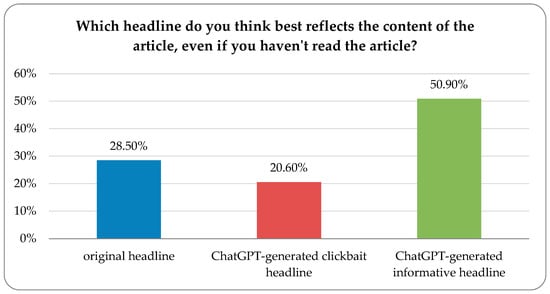 Responses to the question “Which headline do you think best reflects the content of the article, even if you haven’t read the article?” indicate that audiences, while frequently exposed to clickbait headlines, tend to reject this strategy by comparison to clearer and more informative alternatives. The ChatGPT-generated informative headline was chosen by 50.9% of the respondents as the most representative of the article’s content (Figure 3).