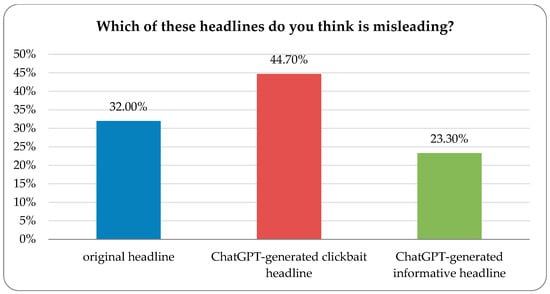 The original clickbait headline was preferred by only 28.5% of the respondents and the clickbait headline generated by ChatGPT was chosen by 20.6% of the respondents, being the one that recorded the lowest score. Closely related to the above results are also those recorded in response to the question “Which of these headlines do you think is misleading?”. The results confirm the idea that informative and clear headlines are better received by the public and are perceived as more trustworthy and accurate (Figure 4). The recorded percentages indicate the readers’ aversion to clickbait headlines, generated either by human writers or by artificial intelligence. The clickbait headline generated by ChatGPT was perceived as the most misleading, with 44.7% of the respondents identifying it as such. The original headline of the article, which was also of the clickbait type, was considered misleading by 32% of the respondents. Although less commonly perceived as misleading than clickbait headlines generated by ChatGPT, this result still reflects a problem for current journalistic practice, especially for media sources that depend on such strategies to attract readers. The ChatGPT-generated informative headline was perceived as the least misleading, with only 23.3% of respondents considering it as such.