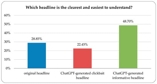 It seems that adopting an informative style not only supports the understanding of the content but also strengthens the relationship of trust between readers and media sources. The results recorded in the group of responses to the question “Which headline is the clearest and easiest to understand?” show a clear public preference for informative headlines. Such headlines are considered clearer and easier to understand. The ChatGPT-generated informative headline is perceived as the clearest and easiest to understand, being preferred by 48.7% of the respondents (Figure 6). This result suggests that headlines constructed in an informative style, avoiding ambiguity and sensationalist language, are the most valued by readers for clarity. The original clickbait headline of the article was considered clear and understandable by 28.8% of respondents, and the ChatGPT-generated clickbait headline was considered clear only by 22.4% of respondents, placing it last.