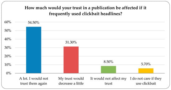 On the other hand, clickbait headlines, both human-authored and ChatGPT-generated, were associated with a lack of trust and a negative perception of the content quality. Readers have considered these headlines to be misleading and expressed a clear preference for informative headlines, which provide an objective and neutral description of the topic. This trend aligns with the growing public awareness of clickbait practices and their desire to consume credible and high-quality content. Furthermore, the study has also highlighted the fact that the frequent use of clickbait headlines can undermine readers’ trust in publications, with an overwhelming majority of respondents stating that they would avoid sources that overuse such practices.