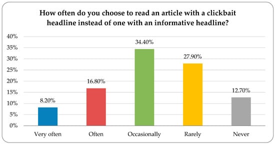 Another objective of this study was to explore readers’ behavior and preferences when faced with different styles of headlines. Most respondents seem to show a preference for informative headlines, given that only a minority declare a high frequency of choosing clickbait headlines (Figure 9). When asked “How often do you choose to read an article with a clickbait headline instead of one with an informative headline?”, most respondents indicated that they choose articles with clickbait headlines only “occasionally” (34.4%) or “rarely” (27.9%). A smaller percentage of respondents, 16.8%, said they choose clickbait headlines “often”, while only 8.2 percent say they do so “very often”. This category represents a segment loyal to clickbait, but is relatively minor compared to those who frequently avoid this type of headline. On the other hand, 12.7% of the respondents indicated that they never read articles with clickbait headlines, indicating a decisive rejection of this editorial practice.