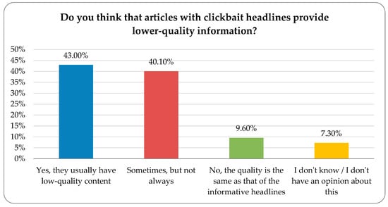 This study also investigated whether readers associate clickbait headlines with lower-quality content compared to articles with informative headlines. The results of the analysis on the perception of the quality of articles with clickbait headlines suggest a predominantly negative opinion from respondents, with 43% of respondents believing that articles with clickbait headlines “usually” offer lower-quality content (Figure 10). Another significant segment, 40.1%, admits that “sometimes” articles with clickbait headlines can have quality content, but not always. This nuance shows that although the general perception of clickbait is negative, there are situations in which readers feel that the headlines do not necessarily reflect the poor quality of the content.