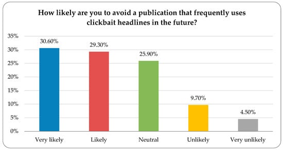 The study also set out to examine the likelihood that, in the future, readers will avoid publications that frequently use clickbait headlines. The results of the analysis on the likelihood that they will avoid publications that frequently use clickbait headlines highlight a general tendency toward avoiding these sources, with 30.6% of the respondents believing that they are “very likely” to avoid such a publication, and 29.3% stating that they are “likely” (Figure 11). These two categories together represent 60% of the respondents, which indicates a clear attitude of rejection towards publications that frequently resort to clickbait. Another significant segment, 25.9%, remained “neutral” in this regard, which suggests that these respondents are not influenced by the clickbait headlines, at least in terms of the decision to avoid publication. Only a small percentage, 9.7%, consider that it is “unlikely” to avoid publications that use such headlines, and 4.5% say that it is “very unlikely” to make such a decision.