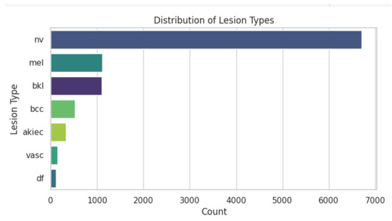 A publicly available dataset for the detection of skin diseases, particularly for black skin and multiple diseases within one dataset, is typically not available. The authors in [] describe the HAM10000 dataset for diverse skin tones, which is used in this study for the detection of seven types of skin diseases. The HAM10000 dataset includes 10,015 dermoscopic images of critical skin conditions. Each image is a high-quality, color photograph with a height of 450 pixels and a width of 600 pixels, resulting in a consistent size across the dataset. It contains many dermoscopic images, each labeled with one of seven different skin disease categories. From the HAM10000 dataset, we selected images of melanocytic nevi (NV), melanoma (MEL), benign keratosis-like lesions (BKLs), basal cell carcinoma (BCC), actinic keratoses (AKIEC), vascular lesions (VASC) and dermatofibroma (DF) for this study.