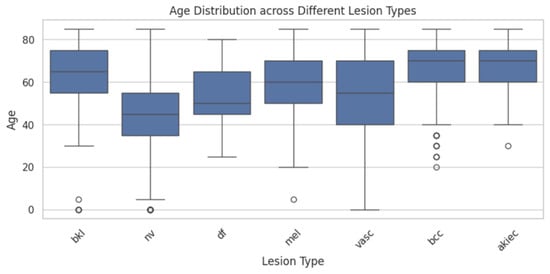 Although deep convolutional neural networks use a mixed approach that combines color pigment analysis with AI methodology, challenges remain. These include data quality issues and evolving environmental conditions, which can introduce errors into deep learning models. Furthermore, there are limitations in the complexity of the overall systems within which machine learning operates []. The works [,,] and [] describe eczema as a condition characterized by skin swelling over a broader area. It is a spreadable disease, also referred to as dermatitis. Eczema is long-lasting but often improves over time. The skin becomes dry and irritated, and patients may experience additional symptoms such as fever and asthma. Among the various types of eczema, atopic dermatitis is the most widespread form. It can affect people of any age, from babies to adults. In younger children, the condition often disappears as they grow older. Eczema commonly appears on body parts like the knees and ankles, and on both dark and light skin, it can resemble goosebumps. Ref. [] describes this type of skin cancer as a common form known as epithelial skin cancer. While it does not metastasize, if left untreated, it can grow aggressively. It presents in various morphological forms, including nodular, pigmented, flat, and cystic. It is a common type of squamous cell carcinoma that is non-invasive and can be treated without surgery. It is less pigmented and frequently appears on the face. The affected skin often shows signs of severe sun damage caused by UV light []. The authors in [] discussed the ‘Benign Keratosis’ category as broad, including seborrheic keratosis, commonly referred to as ‘senile warts’, as well as its flat form, known as solar lentigo, and lichen planus-like keratosis (LPLK), which is characterized by inflammation and the worsening of seborrheic keratosis and solar lentigo. Moscarella et al. [] further elaborated that these three conditions can appear in different dermoscopic forms, and due to their biological similarities, they are often grouped together and classified under the same general category in histopathological reports. The dermoscopic features of lichen planus-like keratosis are challenging to distinguish, as they exhibit characteristics that can lead to frequent biopsies or excisions. This type of skin lesion is non-cancerous and is considered an inflammatory response to minor trauma or benign growth. Under dermoscopy, the appearance of this lesion features a central white area surrounded by reticular lines at its edges, indicating fibrosis []. This type of skin lesion is non-cancerous and falls under different forms of melanocytic tumors. These lesions appear distinctly under dermoscopy, exhibiting a symmetrical distribution of colors and structures, unlike melanoma []. This type of skin lesion dataset includes pyogenic granulomas, angiokeratomas, and cherry angiomas []. Hemorrhages are also classified within this category. Under dermoscopy, angiomas are identified by their solid clots, which appear purple or red and are also referred to as lacunes [].