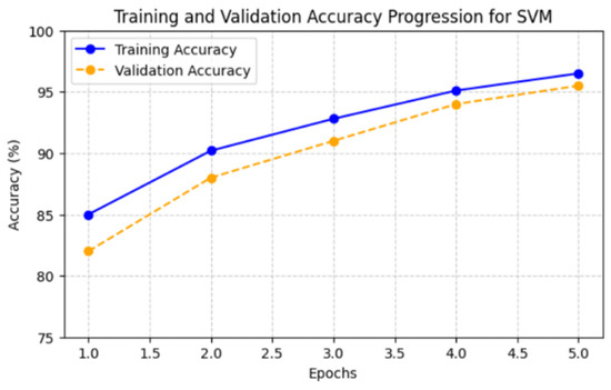 The accuracy achieved from the SVM classifier using features extracted from MobileNetV2 is 98.08%. The grid search process identified the best parameters for the model, optimizing its performance. The evaluation of the trained model revealed not only a high accuracy but also a solid classification performance across various skin lesion types, as demonstrated by the classification report. Figure 8 illustrates the training and validation accuracy of the SVM classifier over the training epochs, showcasing a gradual increase in accuracy for both sets. This convergence of training and validation accuracy indicates effective learning with minimal overfitting, underscoring the model’s robustness in accurately classifying skin lesions.