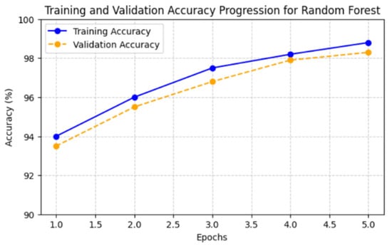 The proposed methodology achieved a high accuracy of 98.32% for skin lesion classification using the Random Forest classifier with DenseNet121 as the feature extractor. Figure 9 illustrates the progression of training and validation accuracy during the feature extraction and classification process. The training accuracy demonstrates a steady increase, reaching a peak value of approximately 98.5%, indicative of the model’s ability to effectively capture patterns from the training dataset. Similarly, the validation accuracy shows consistent growth, attaining a final value of approximately 98.1%, reflecting the model’s robust generalization to unseen data. The close alignment between training and validation accuracy curves indicates minimal overfitting, affirming the model’s capability to accurately distinguish between various skin lesion classes. This exceptional performance highlights the effectiveness of the proposed preprocessing pipeline, including the fine-tuning of DenseNet121 for feature extraction, PCA for dimensionality reduction, and SMOTE for addressing class imbalance. The combination of these techniques enhances the Random Forest classifier’s predictive power, making it a highly reliable tool for dermoscopic skin lesion classification.