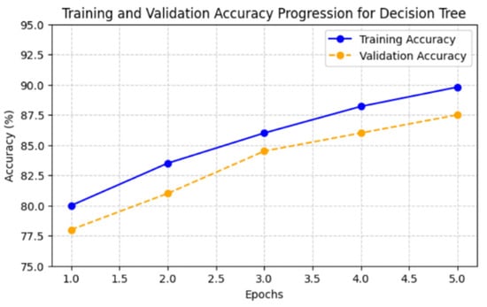 The accuracy achieved by the Decision Tree model is 85.39%. Figure 10 illustrates the training and validation accuracy of the model over five epochs. The training accuracy demonstrates a steady increase. Conversely, the validation accuracy initially rises but peaks at around 90% by the fourth epoch, subsequently declining to 85.39% in the fifth epoch. This divergence suggests potential overfitting, as the model excels on the training data while struggling to generalize to unseen validation data. The growing gap between the training and validation accuracies in later epochs underscores the importance of employing strategies like pruning or early stopping to mitigate overfitting and enhance the model’s ability to generalize to new data.