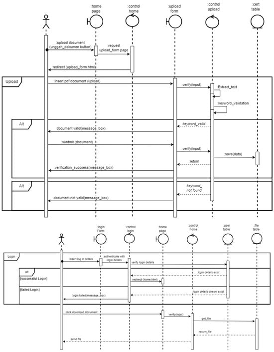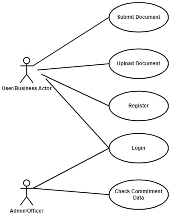A use-case diagram provides an overview of the system’s interaction with its environment (see Figure 4). The system has two actors: the user/business actor and the admin/officer. Users or business actors can log in, register, upload documents to check their validity, and submit documents if they are valid. Valid documents will be checked by the administrator or officer using a random method (sampling).
