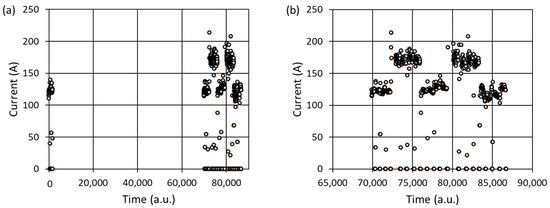 The Open Platform Communications Unified Architecture (OPC-UA) communication protocol was used to collect data from the welding source, enabling manufacturer-independent data exchange between the machines used in industrial systems. The protocol serves as a base for integrating devices in IoT and implementing Industry 4.0 approaches. The Fronius welding source had an option that allowed real-time recording of the required information into a text file, which was later analyzed. The industrial signals collected are presented in the time domain (Figure 2). As shown, the recorded data clustered into dominant areas, with some outliers which could be considered undesirable. For example, in Figure 2a, there are five dominant regions (“islands”) of data, displayed in detail in the zoomed view of Figure 2b. Additionally, two significant regions appear: one at the beginning of the recording (time = 0), where non-zero values of current are observed, and another with zero-value currents below the islands, recorded for time > 70,000. Other points exhibit a random behavior, indicating abnormal data.