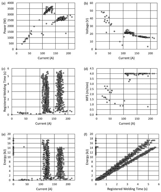Data representation for classification—various combinations of data series with the time domain excluded: (a) power vs. current, (b) voltage vs. current, (c) welding time vs. current, (d) WFS vs. current, (e) energy vs. current, and (f) energy vs. welding time.