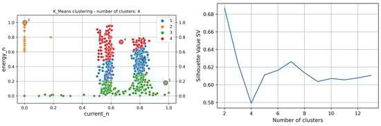 Figure 4 (left panel) shows an example of a k-means clustering result between normalized energy and current data. Although normalization is unnecessary, it is commonly applied, especially for data from unrelated subject areas. In the right panel, the choice of four clusters is justified using the overall silhouette value (SV) parameter, which indicates how effectively data points are grouped. For the i-th data point from a dataset of N points, the individual silhouette value is defined as