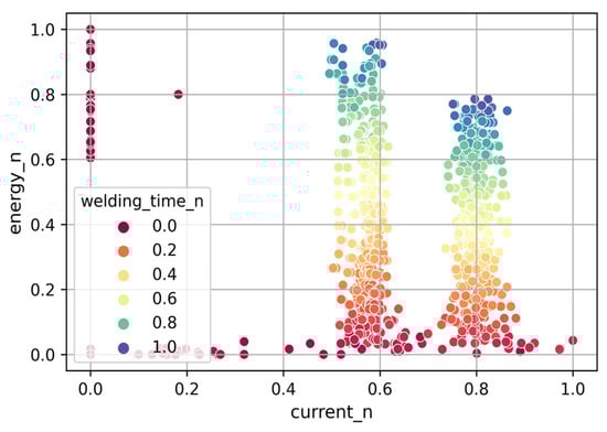 Clusters also provide meaningful interpretations, as shown in Figure 5, which demonstrate the relationship between consumed energy, applied currents, and welding durations (welding_time_n) across clusters.