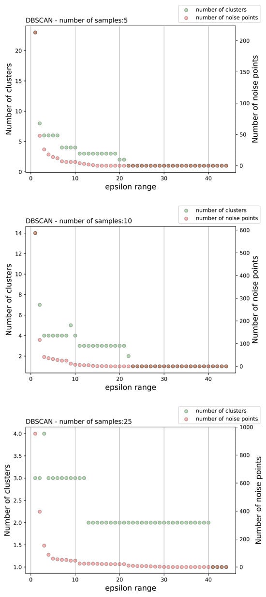 Tuning of the DBSCAN algorithm—results for different minimum numbers of samples constituting a cluster, with adjustments to the attraction region size (epsilon range).