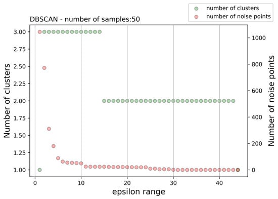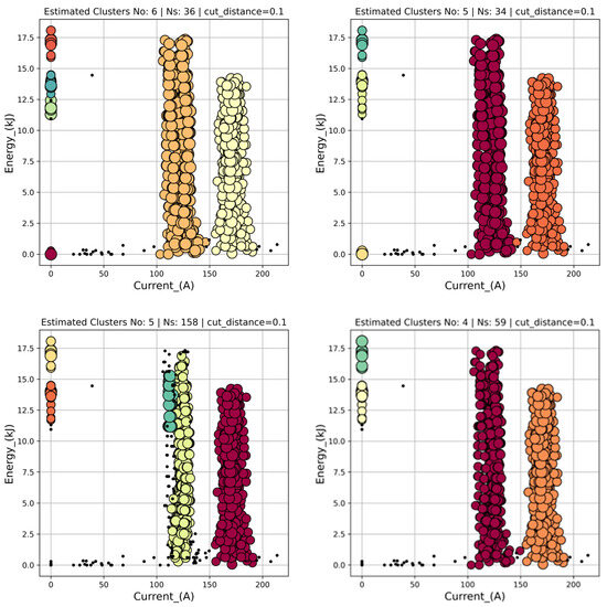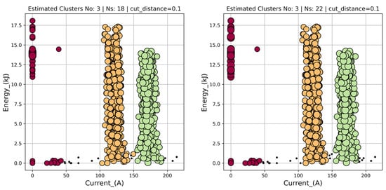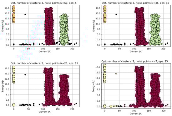 Figure 6 illustrates four cases of clustering using the DBSCAN algorithm, where the assumed minimum number of cluster members is set to 5, 10, 25, and 50 (described in the figure captions as the number of samples). These cases are presented for an exemplary energy–current dataset to determine the optimal value of the impact range (epsilon range). This analysis helps estimate a rational number of clusters for data visualization and assess the relevant number of noisy points, as evident in the figures.