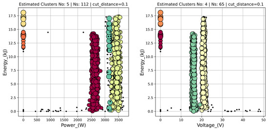 From this perspective, two significant instabilities were identified: the first occurring around the time-point 620 (clearly visible in Figure 13b) and the second near the end of the production process, at time-points exceeding 1000 (most apparent in Figure 13a,b). These two uncertain situations can be detected through direct (xy) dependency analysis, particularly in the energy vs. power relationships shown in Figure 14 and Figure 15. Both figures illustrate the state prior to the abrupt increase in noise levels (left panels) and during elevated noise levels (right panels).