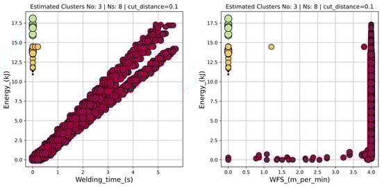 Choosing a minimum cluster size of 30 enables the detection of two clusters at zero-value current, a potentially significant observation about the welding process’s resting state. Additional relationships among data series are shown in Figure 9. Points with higher densities are represented by larger circles, though the uniformity of circle sizes indicates a relatively consistent density within the analyzed welding process.