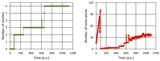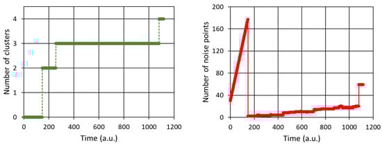 While HDBSCAN provides more precise information compared to earlier methods, the real-time monitoring of process dynamics—specifically, variations in cluster counts and noisy points—remains ambiguous until the process conclusion. This limitation is addressed in Figure 10, which dynamically tracks these variations for a minimum sample size of 30. In the figure, the initial phase is clearly identifiable, marked by the formation of the first two clusters and a simultaneous drop in the number of noise points. Following this phase, the production process transitions to a four-cluster state, during which the number of noise points increases linearly at a relatively small growth rate of approximately 0.015 points per time step. However, toward the final stages of production, a sudden step in noise levels is observed.