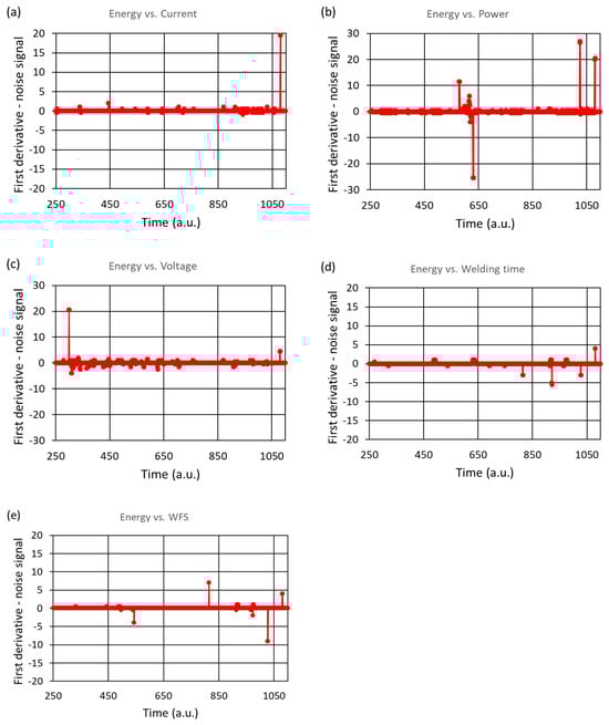 First derivative of the noise signal for 30-point clusters, showing two key instability periods. Results for various combinations of data series: (a) energy vs. current, (b) energy vs. power, (c) energy vs. voltage, (d) energy vs. welding time, and (e) energy vs. WFS.