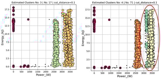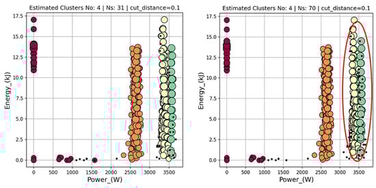 In both cases, noise spikes correspond to scattered energy consumption values (0–15 kJ), while power fluctuates around 3500 W. These points remain unclassified within the clusters.