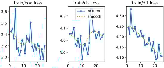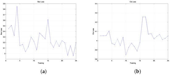 ClsLoss exhibited irregular behavior until the 16th training session, eventually showing an upward trend by the 25th. The classification loss (ClsLoss), which measures the model’s classification predictions’ performance, showed inconsistent values until the 16th training session. However, by the 25th training session, it began to show a rising trend, as shown in Figure 7a.