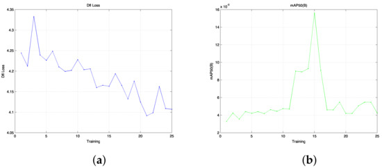 (a) shows the Dal Loss throughout various training sessions, exhibiting an irregular pattern as it moves towards stabilization. This fluctuation indicates challenges in achieving consistent and stable performance. (b) displays the model’s performance based on the mean Average Precision at thresholds ranging from 50% to 95% for the B category (mAP50-95(B)). The performance was inconsistent or fluctuating until it reached its peak during the 15th training session.