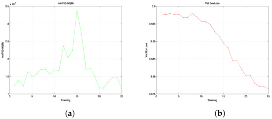In training session 15, the mAP50(B) reached its peak, which means that during this session, the mean Average Precision at 50% overlap threshold for the B category (mAP50(B)) achieved its highest value. This metric indicates that the model performed its best in precision for object detection tasks involving category B at this particular point in the training process. The model’s performance, as measured by the mean Average Precision at thresholds ranging from 50% to 95% for the B category (mAP50-95(B)), was inconsistent or fluctuating until it eventually reached its highest value during the 15th training session, as shown in Figure 5b.
