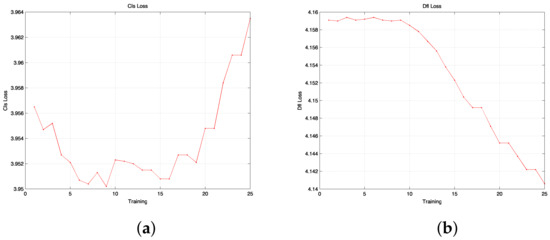 (a) shows that ClsLoss exhibited irregular behavior until the 16th training session, eventually showing an upward trend by the 25th session. (b) displays that DflLoss decreased until the 25th training session, indicating an improvement in the model’s performance.