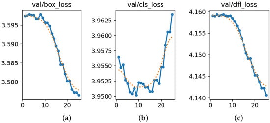 DflLoss decreased until the 25th training session. The distribution focal loss (DflLoss), which assesses a model’s performance, decreased its value until the 25th training session, indicating improvement in the model’s performance over those training sessions, as shown in Figure 7b.