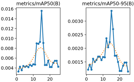 (a) shows that the mAP50-95(B) performance metric was unstable until it reached its peak during the 15th training session. (b) displays that the ValBoxLoss metric gradually decreased and reached a value of 3.8 by the 25th training session.