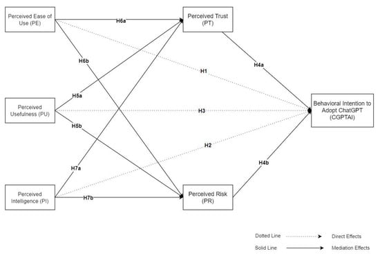 Conceptual model of ChatGPT adoption intentions. The model presents direct effects (in dotted lines) and mediation effects of the key constructs: perceived ease of use (PE), perceived usefulness (PU), perceived intelligence (PI), perceived trust (PT), and perceived risk (PR) on behavioral intention to adopt ChatGPT (CGPTAI). Every labelled hypothesis (H1–H7b) reflects each relationship tested in the study. The mediation effects highlight the role that PT and PR play in shaping the influences of PE, PU, and PI on CGPTAI.