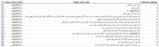 The data in this study were taken from the QurSim [16] dataset based on Tafseer Ibn-e-Kathir [17]. This dataset includes verse pairs from all chapters of the Holy Quran categorized as similar and non-similar. Each pair includes a source verse and target verse, along with a relevance degree rating of (2, 1, 0), where a degree of 2 shows strong similarity, a degree of 1 indicates weak similarity, and a degree of 0 represents no similarity. The original dataset also includes chapter and verse numbers for both the source and target verses. We fetched the actual verse text and created the dataset with verses. The total original QurSim corpus has a collection of 7679 verse pairs.