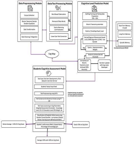 The cognitive-level-based taxonomy and its names have been replaced with new keywords, such as “creating synthesis” []. Capability in online learning environments is measured based on metrics such as learner participation in asynchronous virtual sessions. Students in e-learning environments lack physical interaction with respect to learning and assessment. This gap between students and teachers creates hurdles to not only aligning the objectives of the course but also the measurement of learning objectives in any course domain. Gauging the completeness and correctness of instructional designs for students is a key aspect to consider and must be addressed in a timely and thorough manner so that students receive an effective delivery of content with a feedback assessment mechanism. Optimistically, this aligns course learning objectives with baseline parametric assessments of e-learning-based students to scale up their education through cognitive assessments. In usual learning spheres, students often focus on grades and course completion without fully understanding the material, which results in their cognitive levels remaining unknown. This affects not only the aggregate learning curve but the teaching method as well, making it challenging to deliver interactive content that engages students in line with CLOs and improves learning experiences from assessment results.