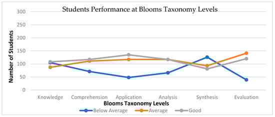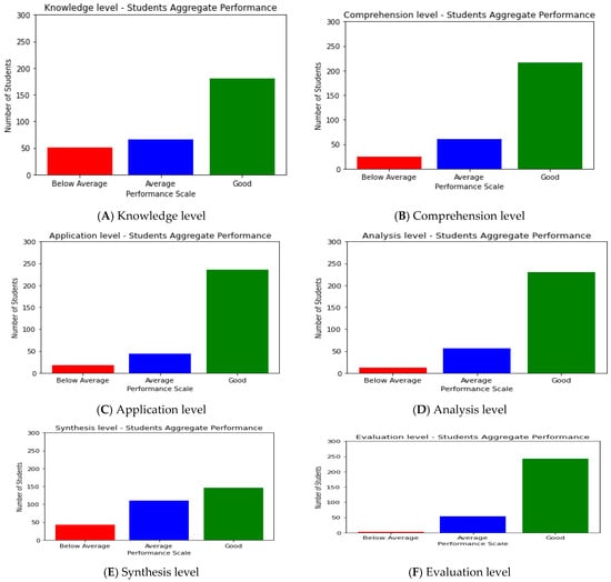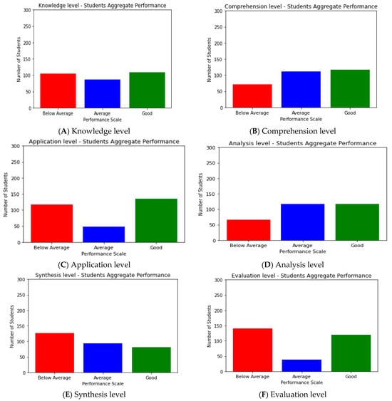 The focus of previous research was primarily on objective-type papers to measure student cognitive abilities using the six BT levels []. To assess student cognitive skills, some researchers worked on a dataset of programming code, while others focused on diagram analysis to connect it to mental states []. However, there has been insignificant research on cognitive psychological evaluation using textual answers to the pool of questions developed at each stage and level of BT with the defined parametric threshold of assessment ranging from Below Average to Good student performance.