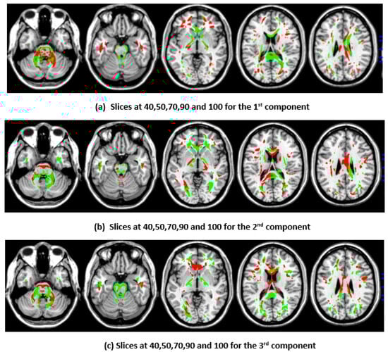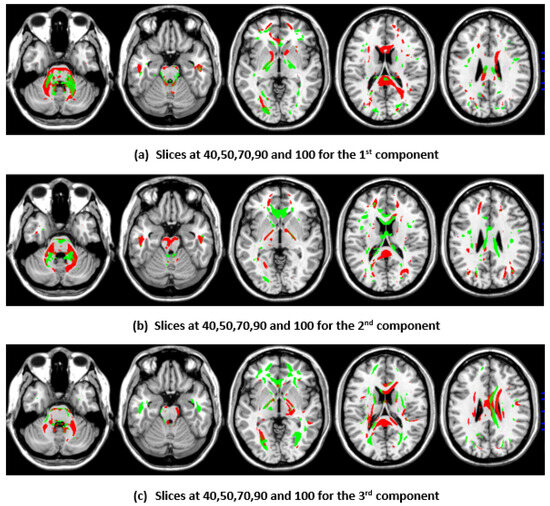 Similarly, the FA regions identified via the first component of the CCA include the corticospinal tract (7.2 cc), anterior thalamic radiation (8.4 cc), and forceps minor (3.4 cc). The second component highlights the corticospinal tract (6.3 cc), anterior thalamic radiation (8.9 cc), forceps minor (9.8 cc), and inferior longitudinal fasciculus (1.2 cc). The third component recognizes anterior thalamic radiation (9.4 cc), the forceps minor (7.7 cc), the inferior longitudinal fasciculus (2.5 cc), and the inferior fronto-occipital fasciculus (2.7 cc). Likewise, the first component of DCCAE points out anterior thalamic radiation (13.1 cc), the forceps minor (7.9 cc), the inferior longitudinal fasciculus (3.4 cc), the corticospinal tract (13.0 cc), and the inferior fronto-occipital fasciculus (2.2 cc). The second component reveals the forceps minor (12.5 cc), the inferior longitudinal fasciculus (2.0 cc), the corticospinal tract (7.9 cc), and anterior thalamic radiation (12.7 cc). The third component includes the corticospinal tract (9,4 cc), anterior thalamic radiation (10.4 cc), and the forceps minor (11.0 cc).