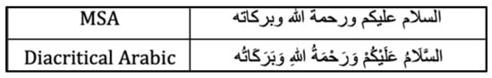 Arabic is the fifth most frequently spoken language worldwide [1]. More than 400 million native and non-native speakers speak Arabic as the official language in more than 20 countries [2]. Three forms of Arabic exist: classical, modern standard Arabic (MSA), and dialectal. Classical Arabic is the formal Arabic used in the Holy Quran. MSA, however, is currently formal Arabic. It is similar to classical Arabic but excludes some features, such as diacritics. It is used in formal speech, written reports, news, and books. MSA can be written with or without diacritics. Diacritics are marks used to clarify pronunciation and meaning in Arabic text, as altering a diacritic mark can change a word’s meaning or grammatical function. Typically, MSA refers to Arabic text without diacritics, whereas diacritical Arabic refers to text with diacritics added for clarity. Figure 1 illustrates an example of this phenomenon. Native speakers resolve ambiguities in non-diacritical texts using context, but it is challenging for non-native speakers and computers to understand non-diacritical texts [3,4]. Dialectal Arabic is an informal language that is used daily and has multiple regional forms.