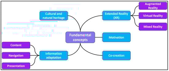 This section introduces the fundamental concepts (cultural and natural heritage, extended reality, motivation, co-creation, and information adaptation) necessary to understand the function of the Motiv-ARCHE application. These concepts are derived from a previous literature review conducted in [] aimed at identifying articles focused on motivation in learning cultural and natural heritage using immersive technologies (see Figure 1). Based on the results of this review, a classification of applications was carried out using the criteria proposed by [,,,,]. These criteria include the following: type of device, level of immersion, activation methodology, execution environment, usage context, motivation, content co-creation, and types of adaptation.