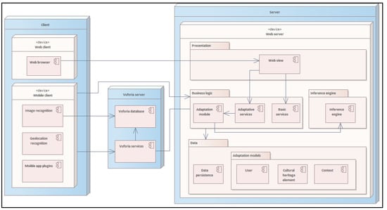 - Business Logic: Includes the implementation of basic services, adaptive services, and the adaptation module. The adaptation module queries the adaptation submodels stored in the data. Then, it communicates with the inference engine to determine the rules that should be applied in generating suggestions about associated content, heritage elements, and routes.