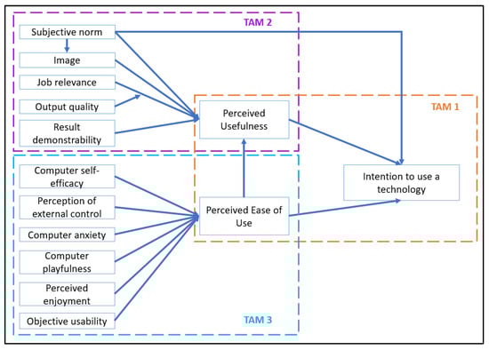 On the other hand, the TAM (Technology Acceptance Model) test was developed in []. It aims to explain how and why users adopt certain technologies. This test focuses on perceived usefulness, which refers to how the use of technology improves performance in specific activities, and perceived ease of use, which is related to the ease of use of the technology (see Figure 3). However, this model has been updated with additional variables. The most recent version of this model is TAM3, which was defined in 2008.